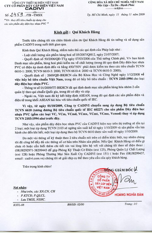 Từ ngày 01/10/2009 công ty dây cáp điện CADVIVI chuyển sang áp dụng Bộ tiêu chuẩn TCVN 6610 (tương đương bộ tiêu chuẩn quốc tế IEC 60227) cho sản phẩm dây cáp điện bọc nhựa PVC (gồm các loại VC, VCm, VCmd, VCmx, VCmt, VCmo, VCmod) thay vì áp dụng TCVN 2103:1994 như trước đây.